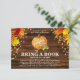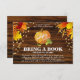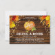 Une jolie carte d'automne rustique "Apportez un Livre" avec un arrière - plan en bois foncé, un pompage plus glacé, congé d'automne et confettis de parties scintillant en faux or. La meilleure façon de demander aux clients d'apporter un livre au lieu d'une carte à votre fête de baby shower.