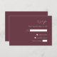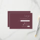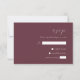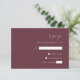 Cette simple et élégante carte de mariage RSVP comporte du texte blanc aligné sur la marge droite d'un arrière - plan bordeaux foncé. Les lettres "rsvp" apparaissent en script calligraphique, avec un texte en italique personnalisable et des espaces pour les réponses des invités ci-dessous. Le dos de la carte est bourgeois solide.
