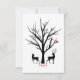 Cette carte RSVP de mariage hivernal est composée d'un couple de chevreuils et de daims en silhouette. Ils sont debout sous un arbre sans feuilles avec un oiseau rouge tout fait en noir, blanc et rouge.
