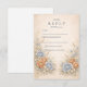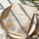 This romantic wedding design features soft blue and peach florals arranged in a delicate garden composition. Inspired by wildflowers and classic botanical illustrations, the artwork blends muted neutrals with airy florals for a timeless, refined look. The elegant layout and gentle color palette make it ideal for couples planning a nature-inspired wedding with a graceful, understated aesthetic that feels both modern and enduring.