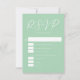 Cette carte RSVP de mariage vert menthe douce présente une typographie blanche chic pour une cérémonie de printemps en plein air. Écriture simple et élégante sur une carte verte pastel solide et tranquille pour un espace jardin.