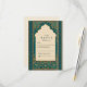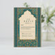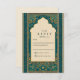 An opulent Islamic wedding design featuring a teal and gold arched frame inspired by mosque architecture and Persian artistry. With intricate floral motifs and geometric symmetry, this invitation exudes elegance, spirituality, and timeless cultural refinement — ideal for a luxurious Islamic wedding.