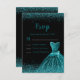 A beautiful teal blue themed elegant watercolor dress gown on a black background with faux glitter at the top and bottom of the card.