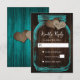 Rustic rustic wedding RSVP card featuring a mason jar with two burlap hearts against a barn wood background. There are two burlap hearts on a teal wood background at the back. Easily personalize this RSVP card online. Matching items available to complement this romantic rustic teal wedding RSVP card.
