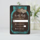 Rustic teal wedding RSVP card featuring a mason jar with two burlap hearts against a barn wood background.