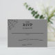 Cette carte RSVP ou réponse peut être customisée avec votre propre date. La carte simple dispose de places pour que vos invités écrivent leur nom et pour vérifier s'ils seront présents ou non et remplir le nombre total d'invités dans leur fête. Le lettrage noir est placé contre un arrière - plan gris avec un accent de toile d'araignée noire dans le coin supérieur.