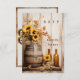 Carte de réponse de mariage rustique avec de vieilles bouteilles de verre ambré et un tonneau de whisky rempli de jolis tournesols. Le verso comporte une bordure en bois rustique et deux bobines de corde pour vos initiales. Créez le vôtre en personnalisant le texte et la police.