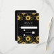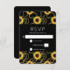 Une carte RSVP de mariage avec un motif élégant et élégant. Joli tournesol jaune et feuilles verts entourés de fines chaînes d'or. Arrière - plan noir.