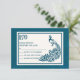 Carte RSVP de mariage avec l'image d'un paon turquoise sur un carré couleur crème avec un arrière - plan turquoise. Style art déco audacieux. Design et chic.