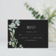 Cette carte de réponse RSVP mariage élégante présente une belle aquarelle vert feuille d'eucalyptus vert sauge sur un arrière - plan noir. La carte peut être personnalisée pour inclure vos propres détails. Que vous planifiez un mariage extérieur rustique ou une aventure formelle, cette carte RSVP est le complément parfait à votre papeterie mariage.
