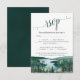 This beautiful RSVP card features a rustic watercolor painting of Lake Tahoe with a green pine trees and mountains in the background. The title is written in lacy script calligraphy and there is space for your guests to indicate the total number that will be attending and their choice of meal.