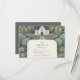 Une charmante carte RSVP conçue avec un scénario de forêt de contes et une chapelle blanche pittoresque nichée dans une verdure luxuriante. Ce thème champêtre romantique et enchanteur est idéal pour les mariages d'inspiration conte de fées dans un cadre magique et nature.