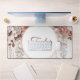 Un magnifique portrait de glycine en cascade délicatement d'en haut, avec un brun chocolat riche entrelacé de teintes dorées et blanches roses contre une toile blanche, offrant un mélange de chaleur et d'élégance.
