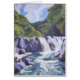 Peinture acrylique d'une cascade avec de l'eau qui tombe sur les rochers en contrebas ; arbres en arrière - plan dressés contre un ciel bleu avec des nuages blancs. Carte blanche pour votre propre message.