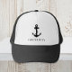 Casquette noir sur le thème nautique avec une illustration d'une ancre classique et le nom de votre bateau en simple typographie.