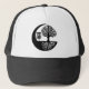 Disc golf themed trucker hat. Black and white disc golf basket and tree roots silhouette.