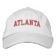 Broderie Rouge Atlanta sur casquette en coton blanc. Fait un cadeau merveilleux pour tous ceux qui aiment Atlanta GA! Si vous préférez avoir votre texte personnel, il vous suffit de cliquer sur le bouton "Personnaliser ce modèle" pour entrer votre choix de texte personnalisé. La broderie est également personnalisable à d'autres choix de couleurs en sélectionnant le bouton "Modifier la conception". Vous pouvez également choisir la couleur du casquette sur la page principale de l'article.