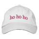 Ce casquette de vacances amusant brodé comprend les mots "ho ho ho ho" en texte rose.