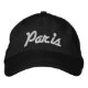 Broderie Paris Blanc sur casquette en coton noir. La broderie est personnalisable à d'autres choix de couleurs en sélectionnant le bouton "Modifier la conception" de l'outil. Vous pouvez également choisir la couleur du casquette sur la page principale de l'article.