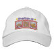 Casquette Patriotique brodé avec des symboles américains bordés de rayures rouges et blanches et d'étoiles dorées sur le bleu aux coins. Tarte à la pomme, baseball et hot dogs avec le texte ci-dessus disant American As :