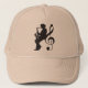 A cap with the silhouette of a saxophone player en profile with his back against a G-key. Un design jazzy. Jazz it up !!