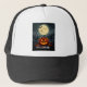Un design à thème halloween avec un citrouille effrayant dans une forêt sombre avec des chauves-souris autour.