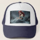 C'est un chapeau de camionneur. La couleur casquette est bleu épais. Le design est vu comme une femme. Ce casquette est esthétique, attrayant, élégant