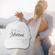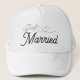 Just Married—casquettes mariages et lune de miel amusants pour mariés et mariés. Annoncez votre statut de mariée à tout le monde. Police de script élégante avec une jolie illustration cardiaque. Lettres noires simples et sucrées.
