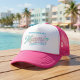 Celebrate your next tropical getaway in style with this Custom Miami Family Vacation Trucker Hat. Featuring a vibrant pink and white mesh design, this hat is perfect for keeping cool under the Florida sun. The retro-inspired script and palm tree graphic capture that classic South Beach vibe.
