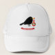 Ce dessin représente un mignon oiseau noir avec une boule de Noël accrochée à sa beck. La boule est rouge avec une bande horizontale verte et un flocon de neige et elle est attachée à un ruban rouge. Il est sur le point de décorer son sapin de Noël. La scène est complétée par une bannière rouge saluant "MERRY CHRISTMAS".