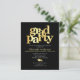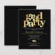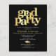 Soyez fier, réjouissez-vous et annoncez au monde que votre diplômé préféré a atteint son objectif avec cette invitation de fête économique, simple, moderne et personnalisée. Une typographie grasse et graphique en faux or et une icône de bouchon de champagne, ainsi qu'une typographie blanche supplémentaire, se superposent sur un fond noir. Personnalisez le texte personnalisé avec le nom de votre diplômé, l'école, l'année de promotion et les informations sur la fête. Garantit d'ajouter une touche de style amusant à leur occasion spéciale !