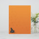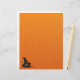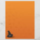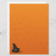 Illustration Halloween joyeuse avec un casquette sorcier aux étoiles dorées et la lune et une araignée suspendue sur un arrière - plan orange aux formes de motif jack-o-lanterne.