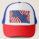 Montrez votre amour pour les États-Unis avec ce chapeau de camionneur audacieux et patriotique avec un design dynamique de drapeau américain. Les rayures rouges et blanches ondulent fièrement, tandis que les étoiles bleues dominent un motif étonnant et superposé.