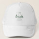 Elegant Green Coquette Script Bride's Name Bachelorette or Wedding Trucker Hat. A modern and minimalistic, olive green coquette styled bachelorette/wedding hat with "bride" in elegant script lettering. Personalize with the bride's name, and bachelorette or wedding location below.