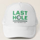 Célébrez le dernier swing du marié avant l'anneau avec ce chapeau de camionneur de fête de bachelor garni de vert, noir et blanc sur le thème du golf. Conçu avec l'expression "Dernier Trou", ce design amusant et audacieux est parfait pour une sortie de golf ou un week-end de célibataire. Un excellent accessoire pour le marié et ses amis, ce chapeau ajoute une touche ludique à la célébration. Personnalisez-le avec le nom du marié pour un souvenir personnalisé !