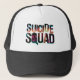 Logo Technicolor 3D Suicide Squad avec un crâne dans la lettre Q. Lettres colorées sur arrière - plan noir.