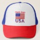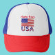 Chapeau de camionneur personnalisé avec le drapeau des Etats-Unis d'Amérique, ou, drapeau américain avec les lettres USA ci-dessous en rouge, blanc et bleu avec étoiles et rayures, trouvé dans le drapeau. Personnalisez le chapeau du camionneur en ajoutant un nom, pour vous-même ou un cadeau créatif. Idéal pour les groupes de voyage, les clubs ou les réunions de famille. Un cadeau amusant pour toute occasion ou événement. Papa adorerait ça pour la Fête des pères. Amusant à porter le jour de l'indépendance/4 juillet.