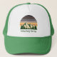 Personnalisez vos chapeaux de voyage familial pour entreprendre un voyage dans la nature cet été ou cet automne. Personnalisez avec votre nom de famille dans un script cursif mignon sous la forêt verte des arbres et le coucher de soleil de montagne foncé pour un séjour de vacances cool pour votre groupe extérieur.