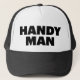 HANDY MAN fun and ironic slogan on trucker hat, black, funny typographic statement, inspired by tv comedy character frank rossitano.