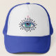 Un oeil mystique à regarder dans les nuances de bleu lavande rose Turquoise sur un chapeau de camionnette bleu et blanc royal. Les cils éclatent de l'oeil comme des rayons de lumière !