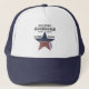 This classic navy blue and white Trucker Hat features a star cutout with blue background and stars on the top half and horizontal red stripes pattern on the bottom, painted on rustic distressed wood for a vintage look, and black text in various fonts and sizes. Choose from 12 solid and combination colors and other style hats, including the popular bucket hat. 100% nylon mesh back keeps you cool. Adjustable from 17" to 24". See "About" this product for more information and care. Happy Birthday America, 1776-2026, 250 Years Freedom. Flag Star
