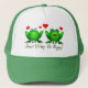 Cute joyeux grenouilles caricaturales vert avec les yeux bleus et les coeurs rouges, votre choix couleur casquette. Ne vous inquiétez pas, soyez chanceux ! Vous pouvez également personnaliser ce design avec votre propre texte et / ou image si vous le souhaitez. Dans la spiritualité animale, le sens des grenouilles comprend le bonheur, l'humour, la santé, la société, le chant et une petite magie nocturne. Amusement et sport pour petits ou grands, amoureux de la nature, fans d'amphibiens, punsters, art original dessiné à la main Sylvia Rose. Visitez-moi sur Twitter @Sylvia_FineArt. Passe une journée agitée.