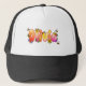 Calling all Olivia! This adorable trucker-style baseball cap features a fun, personalized graphic on the front panel. The name "Olivia" is spelled out in bubbly, sunset-colored letters decorated with wildflowers and cute honeybees.