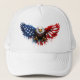 A striking front-profile illustration of a bald eagle mid-motion. With wings fully outstretched, the eagle surges forward in a commanding pose, its sharp golden eye, hooked yellow beak, and extended talons conveying strength, vigilance, and resolve. One wing is rendered in deep navy blue adorned with crisp white stars, while the other flows in bold red and white stripes, transforming the wings into a living embodiment of the American flag. Dynamic paint splashes and dripping accents in red, white, and blue radiate from the feathers, adding a modern, high-impact energy.