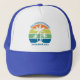 Ces casquettes cool de couchers de soleil tropicaux et personnalisés disposent de 3 palmiers en silhouette contre un ciel orange et bleu accentué de jaune et vert sur la côte. Customisez pour un chapeau de camionneur pour votre escapade sur la côte pour les vacances de printemps, d'été ou de croisière sur l'océan.