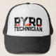 Pyro Technician trucker hat with burning flames. Vintage typography design with hot flaming fire bursts. Custom cap color. Pyrotechnics hat.