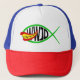 Un design parodique de l'Ichthys (poisson de Jésus). Le design du poisson Ichthys, mélangé au poisson Joker d'un dessin animé de bande dessinée. WWJD en texte noir est à l'intérieur du poisson, demandant "Que ferait le Joker ?"