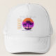 Personalize this vacation trip hat. Memorialize your vacation. Personalize your trip name, destination with destination coordinates. Change the font, font color. Trendy retro design of palm trees and sunset.