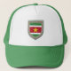 Le drapeau national du Suriname est infusé dans une forme de bouclier gris. Le bouclier qui encapsule le drapeau, est entouré de contours qui sont dans les couleurs du drapeau.