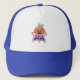 The man is wearing a blue and white trucker hat. The hat has a royal blue brim and mesh back with a white foam front panel. Centered on the white panel is a small, colorful cartoon graphic that depicts an orange, pumpkin-like character wearing a crown and sitting on a purple, winged throne.